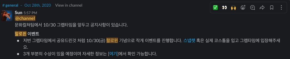 그렙은 매주 금요일 5시 <그렙타임>에 팀마다 일주일 동안 있었던 일을 공유하고 있어요. 그래서 다양한 이벤트들이 금요일에 일어나죠. 이번 할로윈 이벤트도 마찬가지로 <그렙타임>에 열리게 되었습니다.