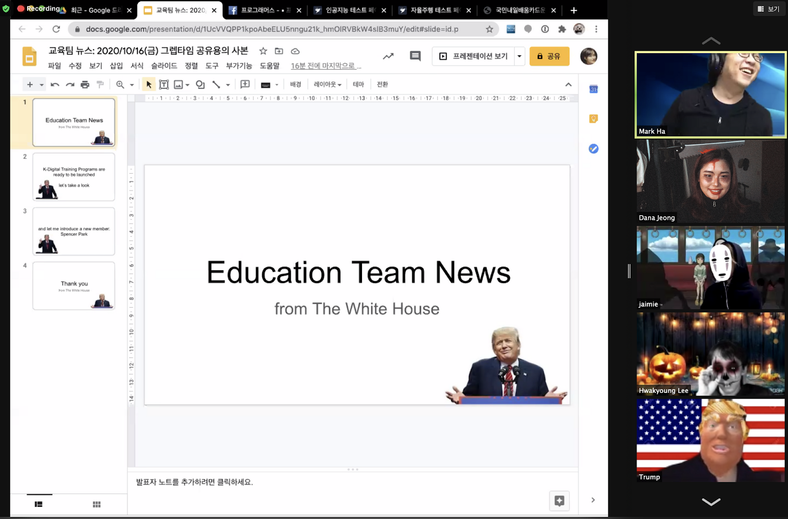 상을 받지 못한 직원이지만 모두의 기억에 매우 인상 깊었던 분들도 참 많았답니다. 그중에 ‘도널드 트럼프' 대통령도 저희 그렙 타임에 참여해주셨는데요! 트럼프 컨셉을 유지하기 위해서 숨겨왔던 영어 실력을 보여주셨답니다.