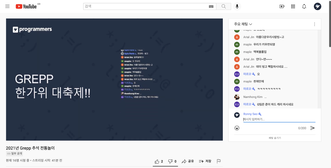 대망의 마지막 게임은 그렙 the 가요입니다. 노래의 첫 시작 부분을 듣고 노래 제목을 맞추는 게임이었어요. 20년대 초반 감성 노래부터, 최신 유행 노래까지 다양한 노래들이 나와서 정말 신나게 놀았던 것 같아요. "너무 신나. 어떡해."라고 채팅창에 남겨준 네오가 가장 기억에 남습니다.❤️
