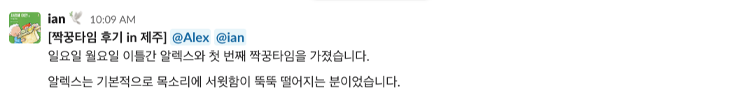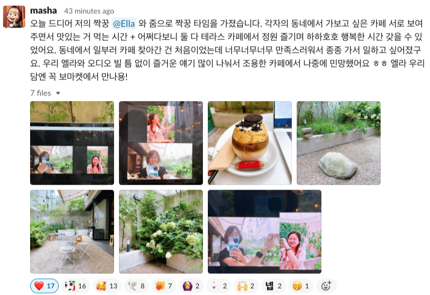 짝꿍 시스템은 재택근무환경에서 시작하게 되었지만, 출근하는 회사에서도 신규 입사자를 위한 좋은 제도라도 생각됩니다. 업무와 전혀 관련이 없는 짝꿍과의 부담없는 대화를 할 수 있다는 것도 장점이고, 사소한 것을 물어보길 기다리는 짝꿍이 있다는 것도 낯선 회사에서 물어보는 일을 더 쉽게 만듭니다.