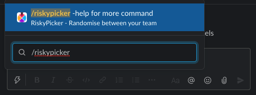 risky picker : slack에서 연동하여 사용할 수 있는 외부 프로그램입니다. Slack에서 /riskypicker를 타이핑하면 이렇게 랜덤으로 해당 채널에 속해있는 한명을 지목하는 돌림판을 사용 할 수 있습니다.