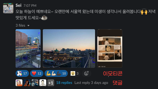 그래서 원활한 의사소통을 위해서 동료들이 남긴 글에 이모티콘으로 반응을 해주고, 댓글로 소통하는 것이 중요한데요.