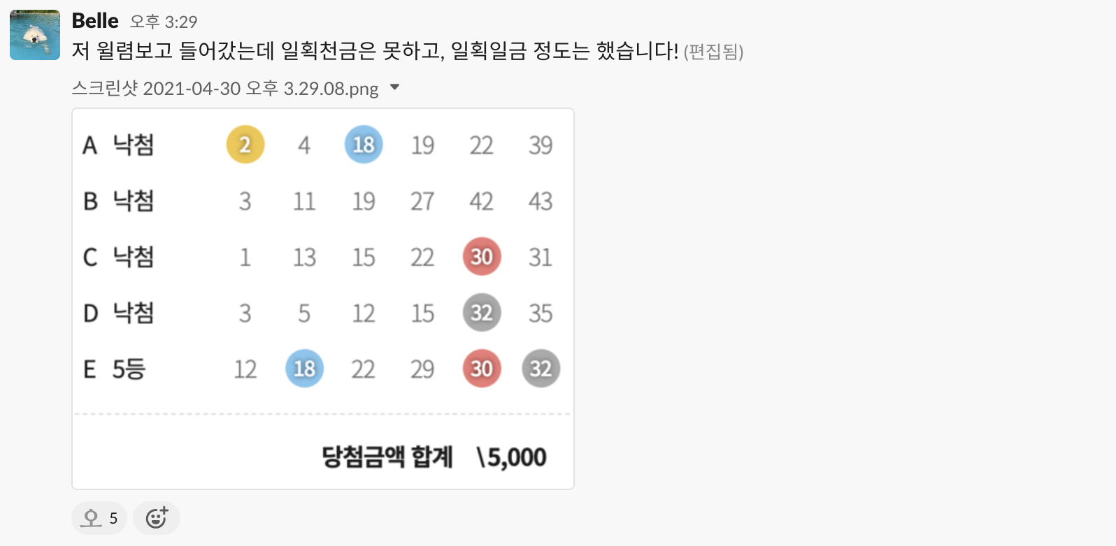 일확천금을 노리는 동호회예요. 매주 연금 복권이나 로또를 구입하라는 알람과 당첨금을 적는 알림이 울려요. 나름 체계적으로 활동하고 있는 이 동호회의 최대 아웃풋은 5,000원이라고 합니다.